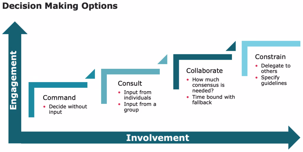 The Collaborate approach enables the leader and team to come to a collective decision, with some helpful guardrails to bound the discussion.